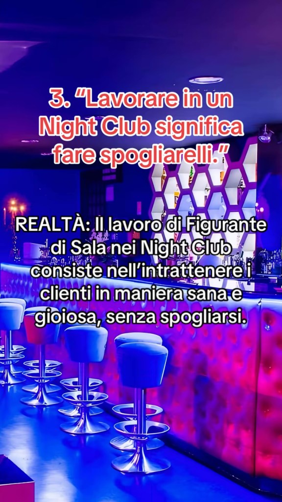 La mansione di Hostess Drink, Figurante di Sala o Ragazza Immagine consiste nell’interagire con la clientela in un ambiente notturno, come Night Club e locali di Lap Dance. Il tuo ruolo sarebbe quello di divertirti e intrattenere gli ospiti, proprio come faresti in altre situazioni sociali (ad esempio, al bar o in discoteca con le amiche), con l’obiettivo di incoraggiare il consumo di drink all’interno del locale.